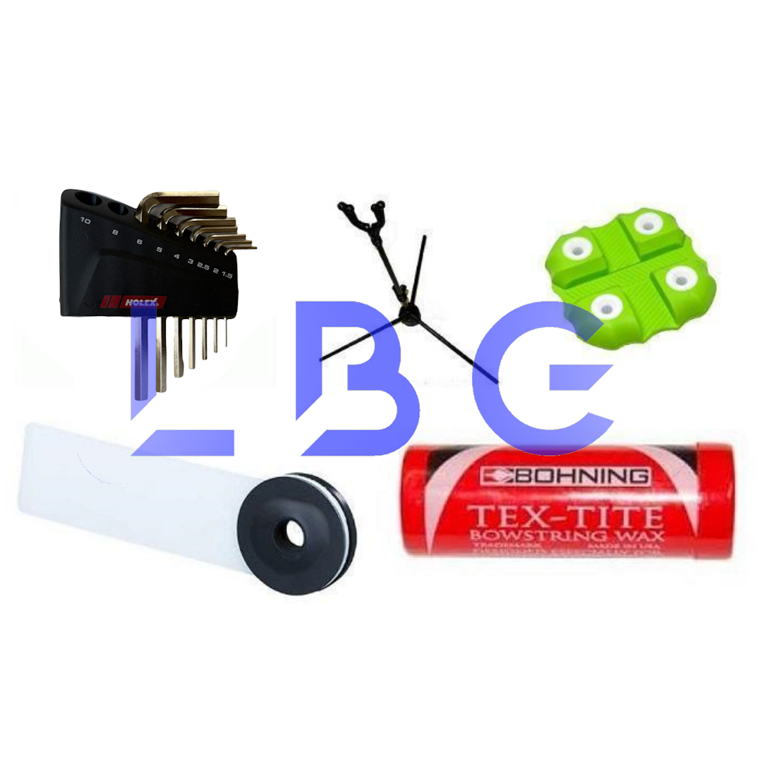 Set comprenant: Extracteur de flèches (A107 ou A121) Graisse pour cordes (A106) Trépied (A110) Jeu de clés (A104) Cache oeil (V119)